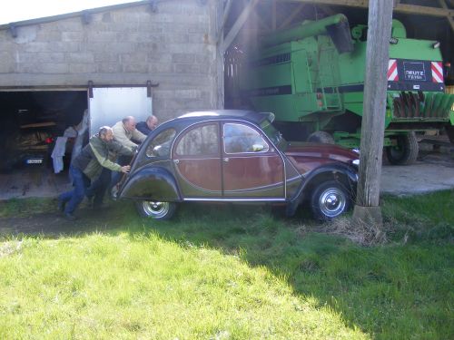 | La 72 est au fond du hangar. Il faut d'abord sortir la 2 cv. Je profite de cette opération pour la sortir de son hivernage. Elle va revenir avec nous. | |