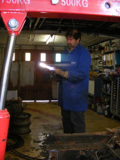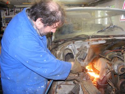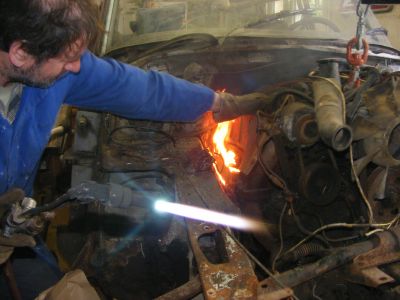 | Je soulève au préalable le bloc moteur/boite avec ma "chèvre" et hop un petit coup d'oxycoupeur et c'est dans la poche. Bon! le problème, c'est que ça met le feu un peu partout. J'avais prévu le seau d'eau et l'extincteur à côté. | ||