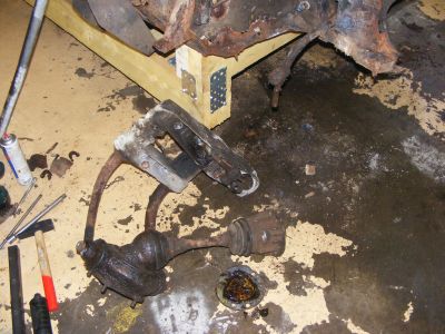 | Je repère aussi le passage des durites. Celles-ci sont différentes avec l'option -15° | J'essaie d'extraire les rotules des bras avant. D'habitude avec un petit coup de chauffe elles sautent. Après des efforts désespérés elles résistent. Tant pis pour moi, je démonterai les demi-trains avec les cardans et les pivots. | |