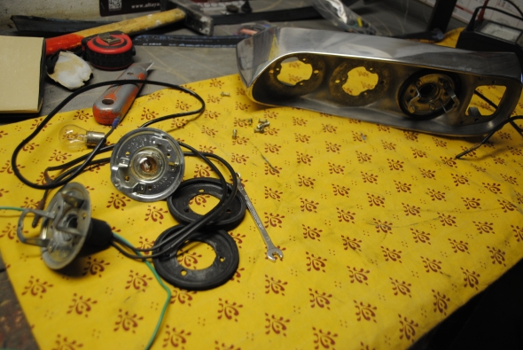 | Mine de rien, une DS c'est très compliqué ! Je me suis dit "tiens je vais prendre de l'avance en préparant mes feux avant" ! Et bien non ! Le temps de répertorier toutes les pièces constituant les feux avant, les nettoyer, les repeindre/poncer/astiquer, et remonter le tout, il s'est passé 4 demi-journées ! Je suis quand même content, le résultat est bon. J'ai quand même un doute sur les paupières. Cet accessoire très en vogue aux USA, et récupéré sur une épave de DS, étaient en très mauvais état. Ils ne sont pas en inox mais en métal chromé. J'ai réussi tant bien que mal à les "dérouiller" mais je pense qu'ils vont rouiller très rapidement ! on verra bien... | |