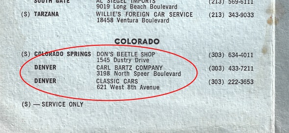 | Concernant les dealers du Colorado, il y a 2 vendeurs de Citroën à Denver, Carl Batz et Classic car, c'est tout faux ! Yvan Frank a acheté le garage de Carl Batz en 1964 et a fondé "classic car", il n'y a jamais eu les 2 garages en même temps ! | ![]() |