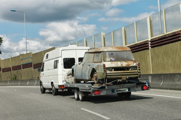 | La même équipe est présente le samedi matin pour l’enlèvement. Nous nous présentons relativement tôt sur le point d’enlèvement pendant que Bernard va louer le porte-véhicules. Nous commençons par vérifier la pression des pneus et dégageons le passage pour que le fourgon et son porte-voitures, soit un ensemble de près de douze mètres, puisse bien reculer au plus près des Citroën. Nous rejoignent aussi deux personnes habituées à travailler pour les vendeurs. Nous ne nous y attendions pas et ceux-ci s’avèreront être très efficace. | |