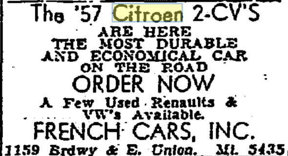 | La première entreprise dans la région de Seattle à vendre des Citroën neuves a été "French Cars Inc.", située au 1159 Broadway dans la région de Capitol Hill à Seattle. "French Cars Inc." apparaît pour la première fois dans l'édition de 1957 de l'annuaire téléphonique, appelée à l'époque "Polk City Directory". Les documents de constitution en société indiquent les noms de Jack & Rhoda Woods et Ralph & Betty Gage. Oui, c'est le même «Jack Woods» qui vendait des Panhards de son appartement d'Eastlake deux ans plus tôt! Les archives de la ville indiquent en outre une date de constitution en société de "French Cars Inc." le 30 juillet 1956, ce qui est en fait relativement tôt en ce qui concerne la production des DS. Mais au moment de la publication du répertoire de la ville de Polk en 1958, "French Cars Inc." semble avoir disparu! | |