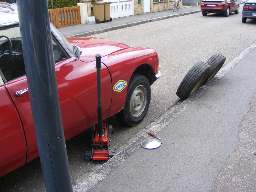 | ...L'équipe d'assistance s'affaire à changer les roues. Et oui, on est comme ça chez Citroën, on n'hésite pas à investir dans des jantes pour gagner du temps. Quelle dextérité de la part de cette équipe d'assistance qui réussira ce tour de force de changer les roues avant en moins d'un quart d'heure! |