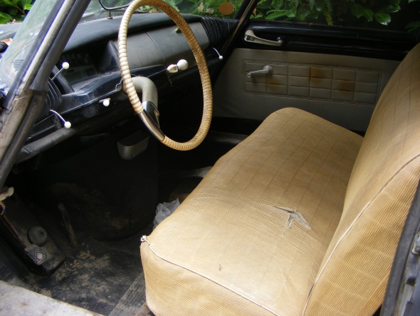 coffre. Sa sellerie est composée d'une armature "classique" à ressorts et d'un habillage en plastique vendu sous le nom pompeux de "similoïd Rio" surnommée très rapidement "habillage paille". Plus tard, le break luxe a eu droit à un plastique unis de type "Bufflon". Très rapidement elle aura droit à 2 sièges séparés à l'avant en option. |
