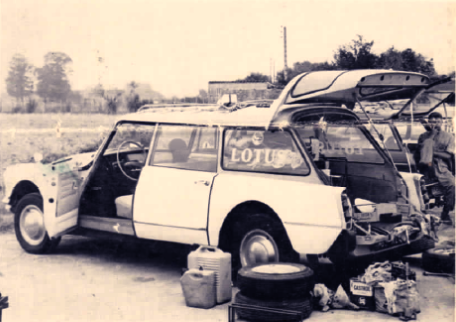 | Évidemment la DS "commerciale" a tout de suite été l'outil idéal pour accompagner le tour de France, à l'image de ces photos du tour 64. Elles ont transporté dans le plus grand confort tout ce qui peut être transporté sur un tour de France. Elle ont même eu droit à toutes les "livrées" possibles et imaginables aux couleurs des différents sponsors du tour de France. A tel point que ce fut un argument publicitaire pour la vente des DS "commerciale" (à gauche). Vous pouvez découvrir le document ci-dessus en format PDF. | Beaucoup de DS commerciales ont terminées leur carrière sur diverses courses de vélo provinciales. |