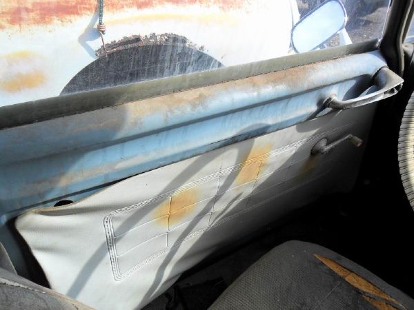 | Les panneaux de portes arrières ont droit aux très "luxueux" petits moignons en guise d'accoudoir. D'ailleurs, la présence de ces moignons , ainsi que le revêtement encore visible à l'arrière du dossier de la banquette avant en "similoïd rio" confirme que nous sommes en présence d'un modèle "luxe". | Maladie très classique sur tous les breaks du monde entier: la corrosion au niveau des glaces de custode. |