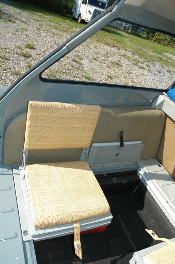 | Nous avons devant nous un break en finition "confort" avec 2 confortables sièges avant séparés et une non moins confortable banquette arrière fixe. Le tout est recouvert d'un délicat tissu à motif en "hélanca bleu" (qui vient tout droit des productions Danche). | |
