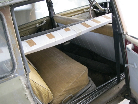 | Les break "luxe" possèdent une banquette à l'avant et une banquette rabattable à l'arrière. La teinte de ce "similoïd rio" est en harmonie avec la teinte de la carrosserie. Je pense que la banquette avant a été changé car c'est une banquette de DS break "commerciale" ! La tôle arrière de cette banquette devrait être lisse et recouverte du "similoïd rio". Frédéric a pu se procurer une ligne d'échappement complète d'origine Citroën, des rétros, des phares, des éclairages de plaques arrières... c'est toujours appréciable. | |