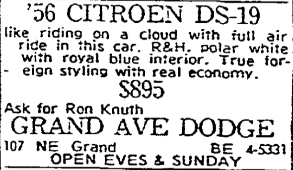 | DS 56 à vendre dans le "oregonian newspaper" en 1961 | DS 56 à vendre dans le "Portland newspaper" en 1960 |