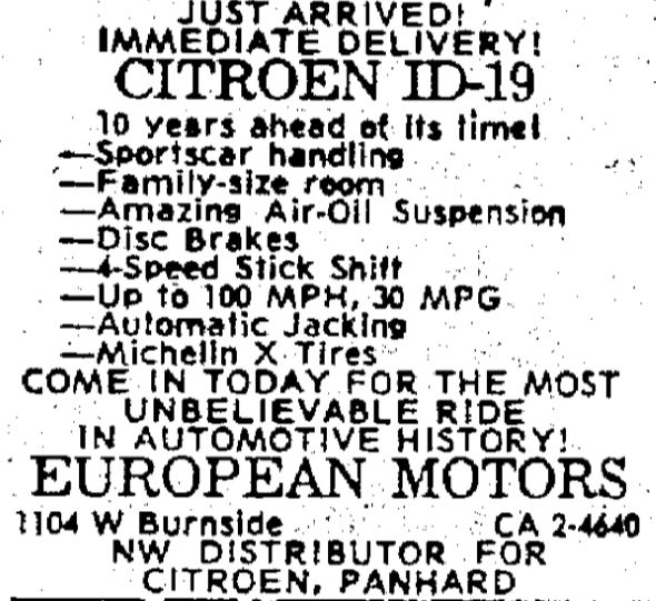 la DS! "EUROPEAN MOTOR SALES" Le tout premier concessionnaire Citroën "officiel" en Oregon remonte à 1956 lorsque "European Motor Sales" de Portland a annoncé qu’ils deviendraient bientôt un concessionnaire de la DS19 nouvellement introduite, en plus des voitures Panhard et Renault. À mon grand étonnement, "European Motor Sales" avait effectivement installé une voiture de démonstration DS19 très tôt le 28 septembre 1956 dans ses locaux. La presse locale a couvert l'événement dans le journal du lendemain |